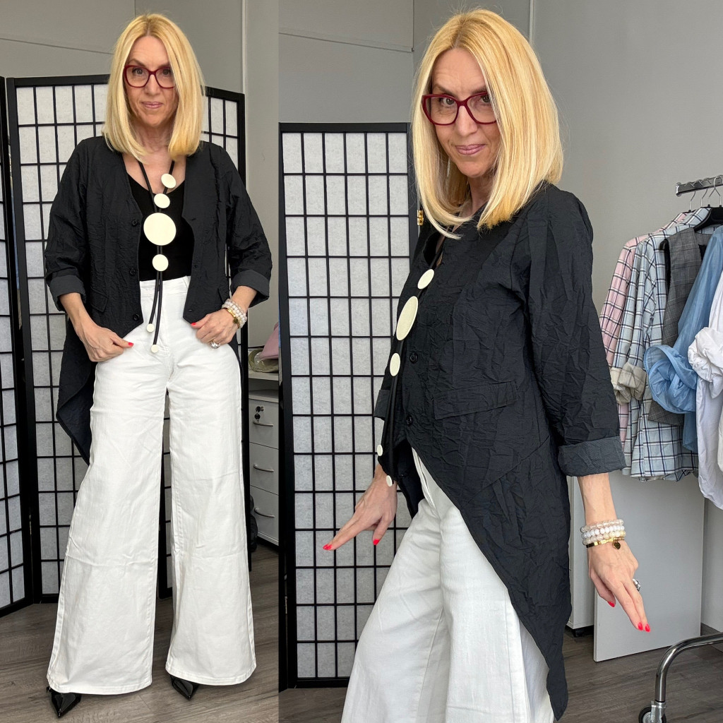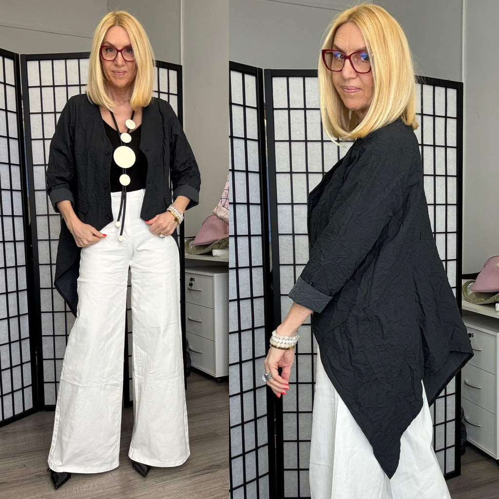 Ell rövidebb, hátrafelé hosszabbodó aszimmetrikus blézer.
