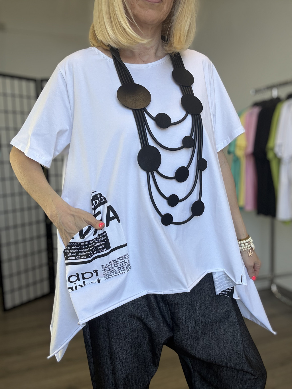 Környakú, lefelé bővlő tunika, nyomott mintás zsebekkel.