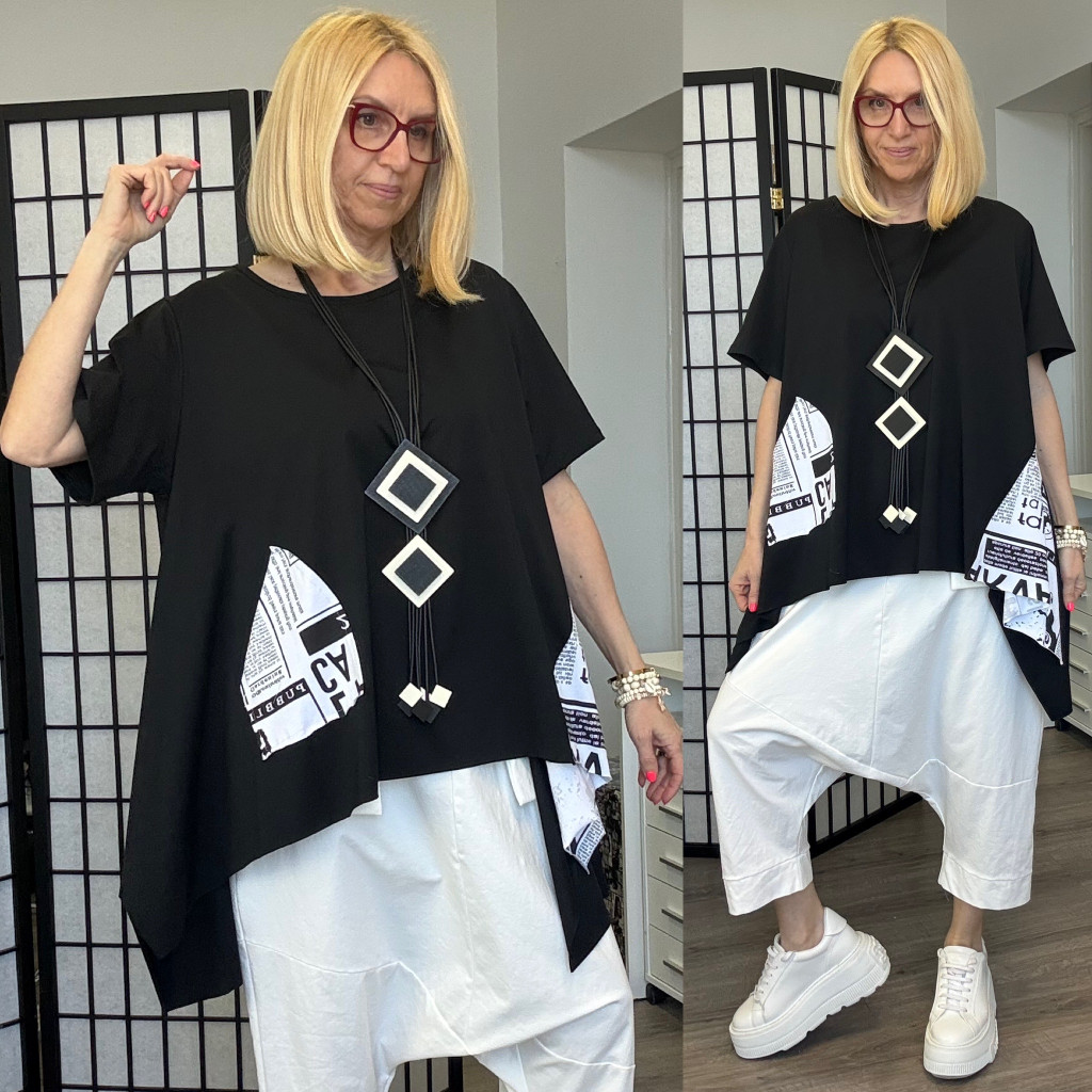 Környakú, lefelé bővlő tunika, nyomott mintás zsebekkel.