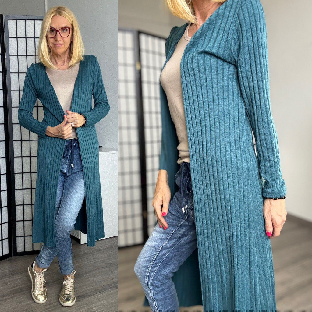 Rendkívül rugalmas anyagú földig érő, hosszú kardigán.