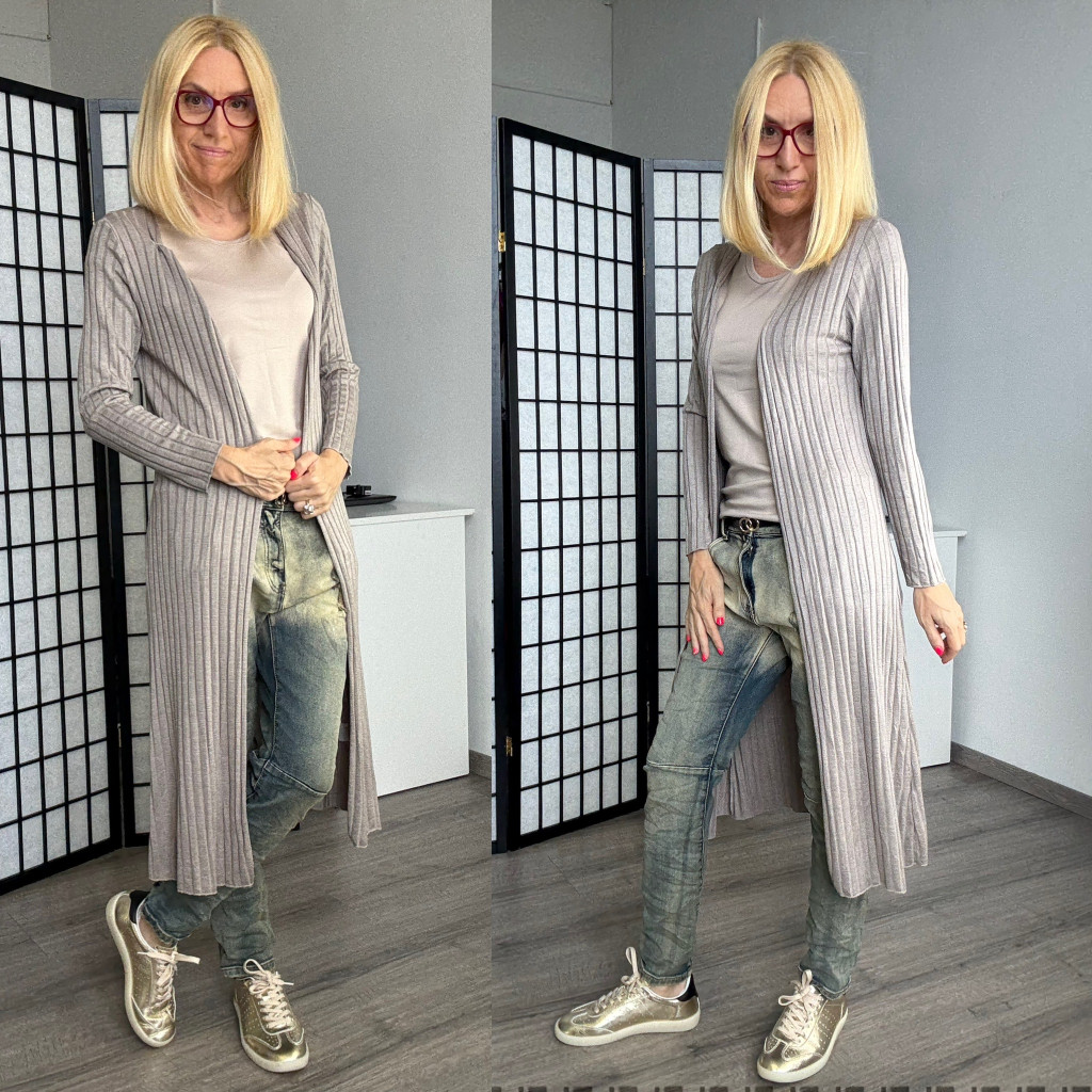 Rendkívül rugalmas anyagú földig érő, hosszú kardigán.