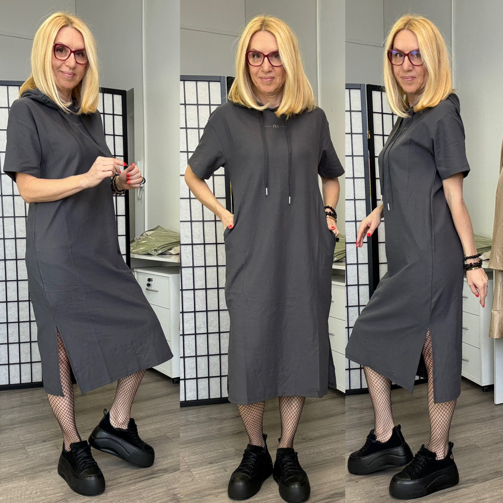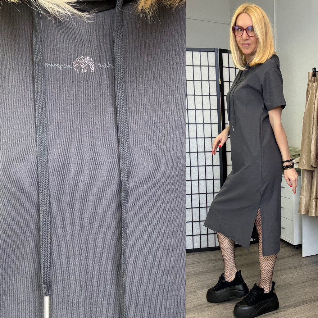 Kapucnis, zsebes egyenes vonalú tenisz ruha. Apró strasszokkal díszítve.