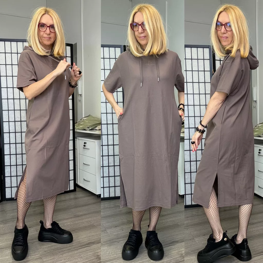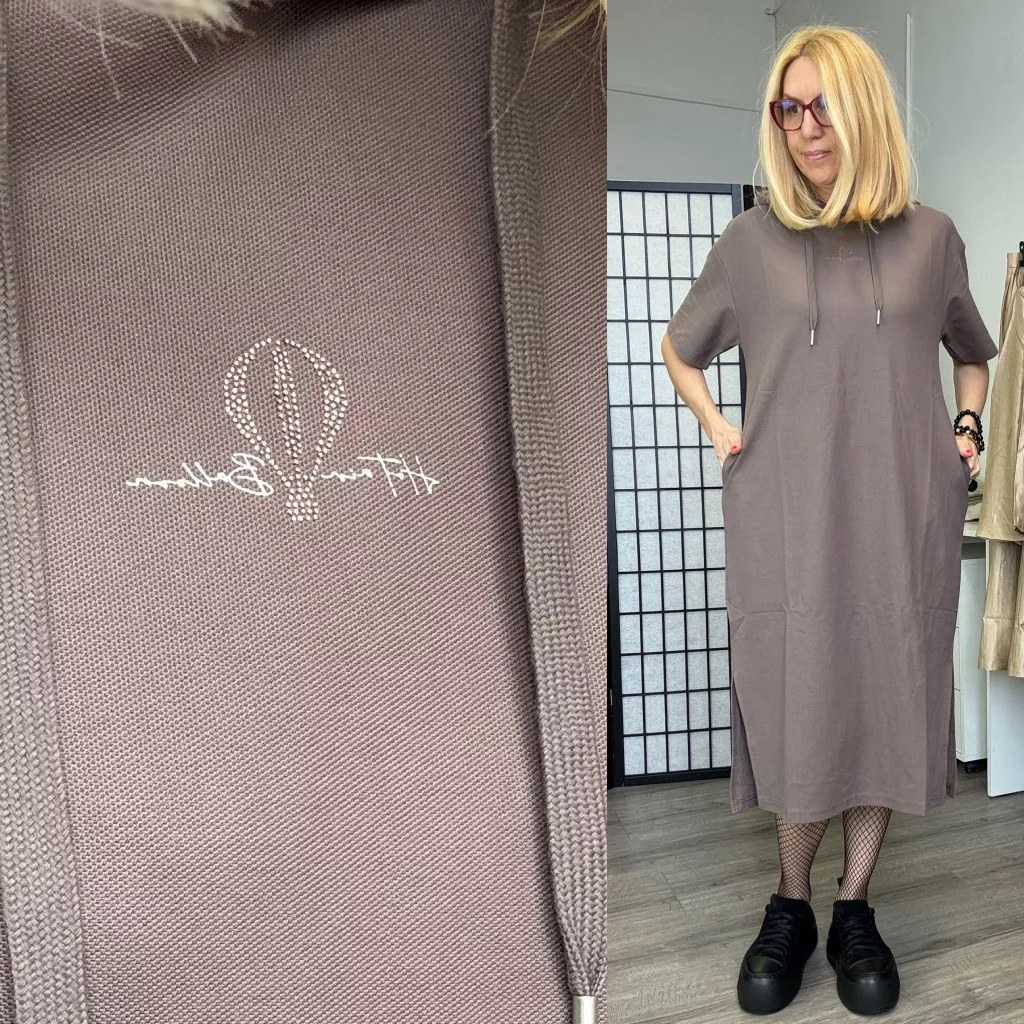 Kapucnis, zsebes egyenes vonalú tenisz ruha. Apró strasszokkal díszítve.