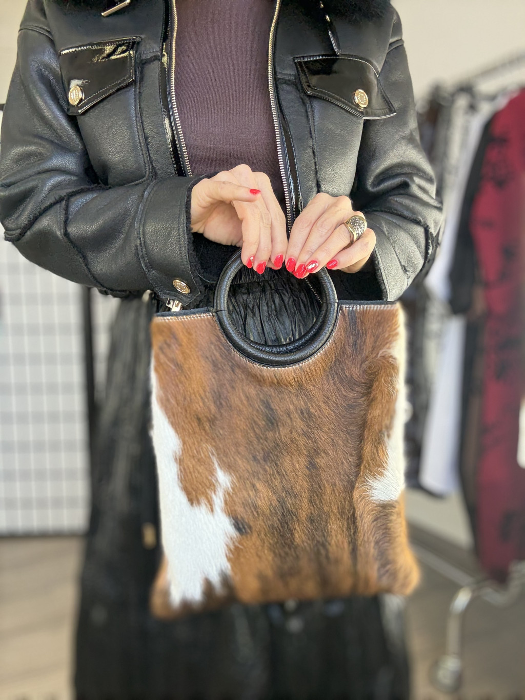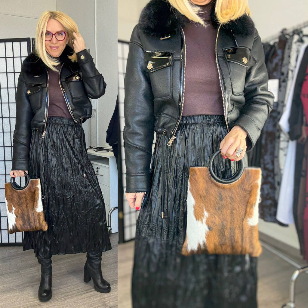 Szőrös kézitáska bőr neszeszerrel, és hosszú pánttal.