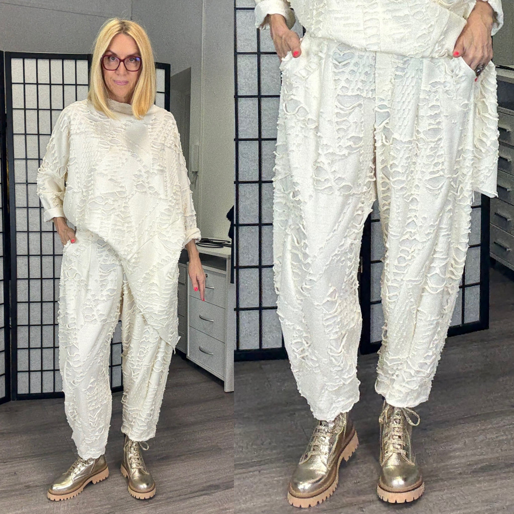 Gumis derekú nadrág, csípőben bő fazon, lefelé szűkül.