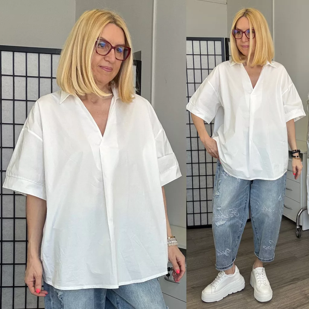 Lenge, könnyű V nyakú női ing. Hosszított fazon, rövid ujjú