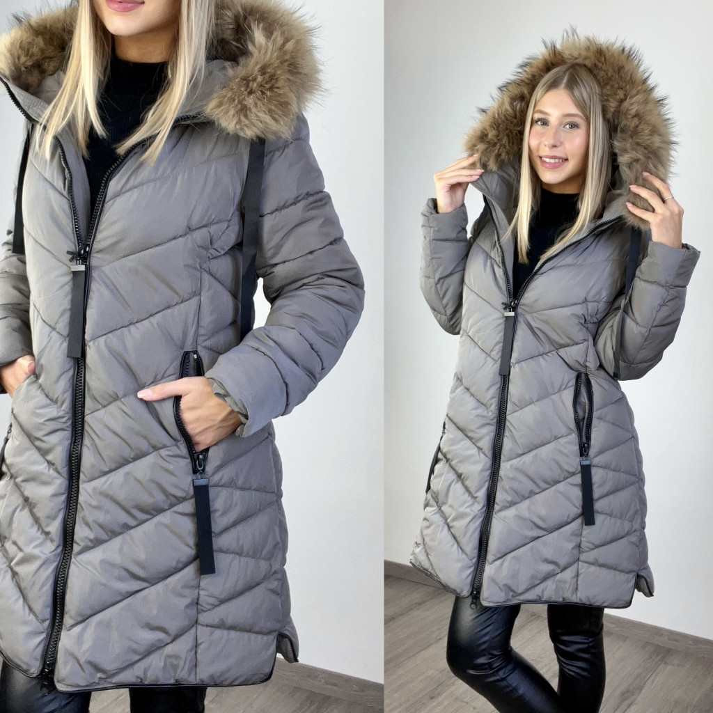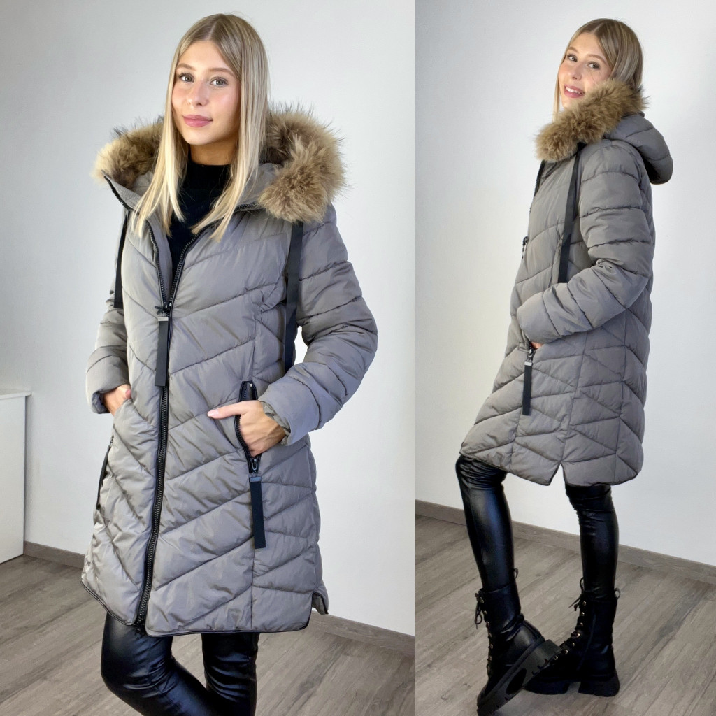 Ez a szőrmés kapucnis télikabát stílusos és meleg viselet a hideg napokra. Cipzárral záródik, a szőrme patenttal lekapcsolható a kapucniról. Zsebekkel ellátott kabát, így egyaránt sportos és csinos utcai viselet is.
