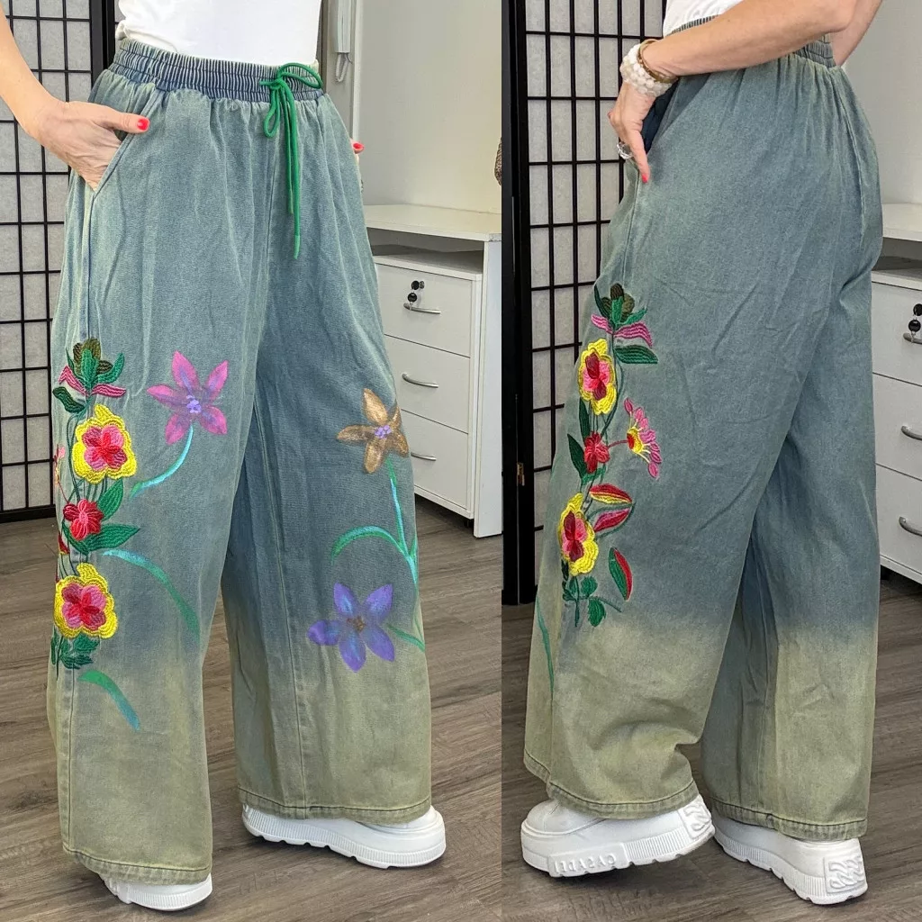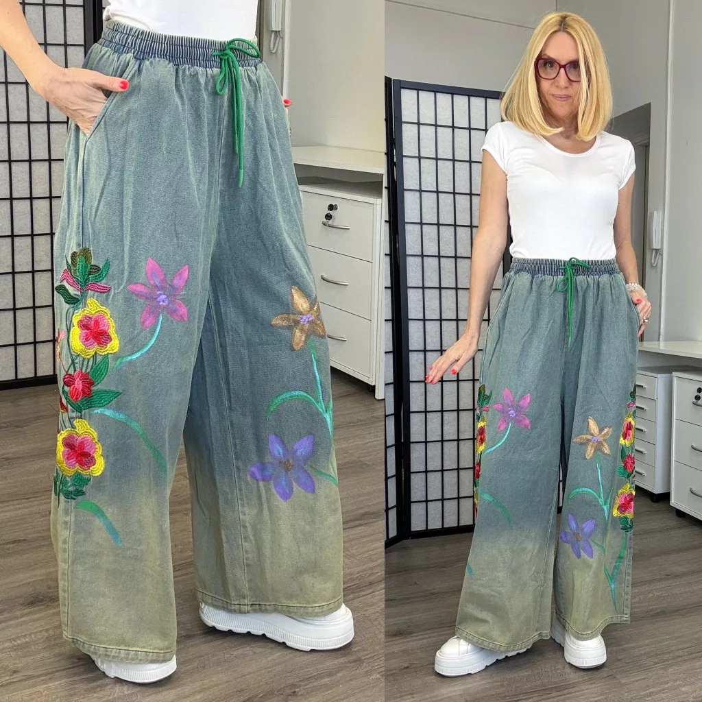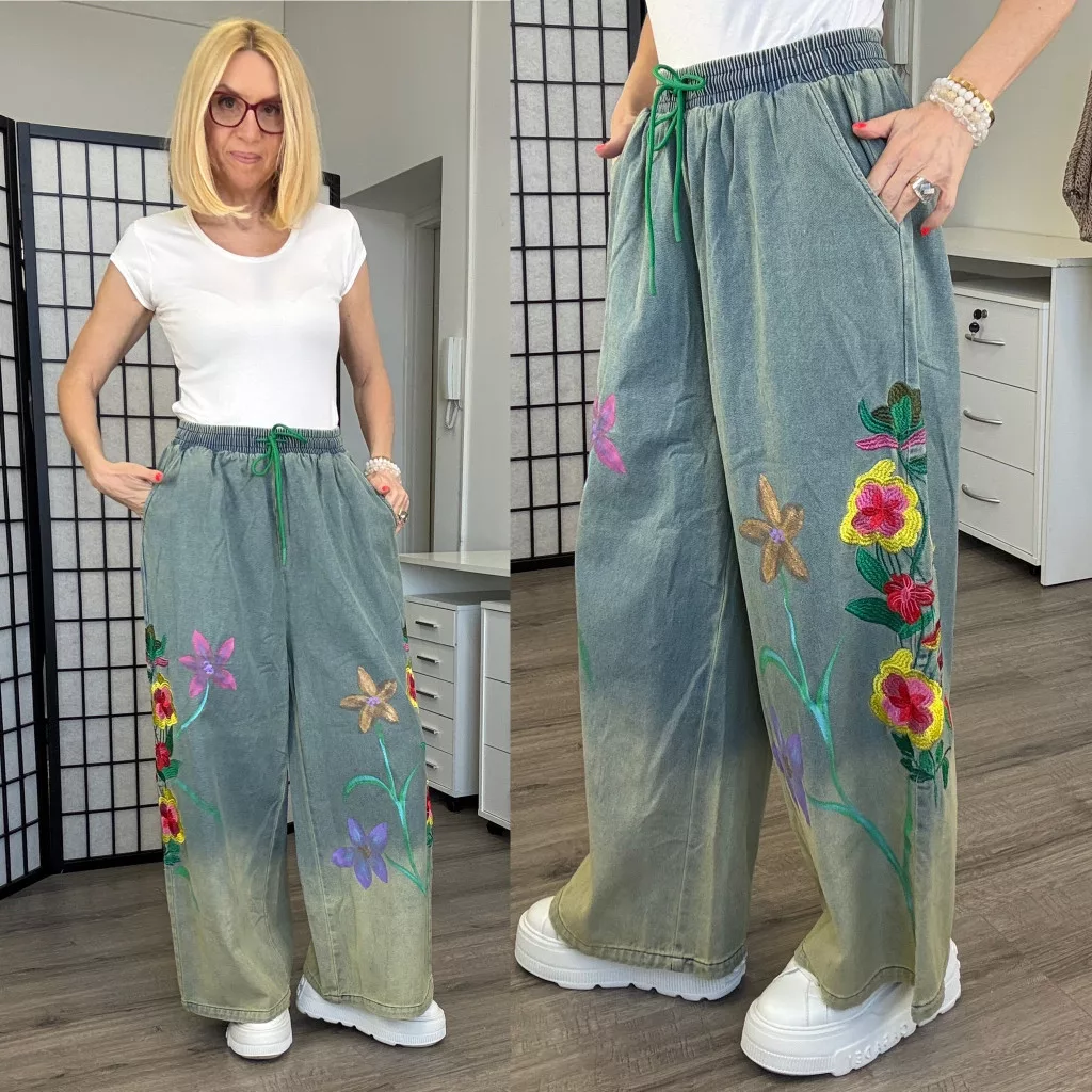 Gumis derekú , megkötős bőszárú farmer. Kétoldalán hímzésekkel.