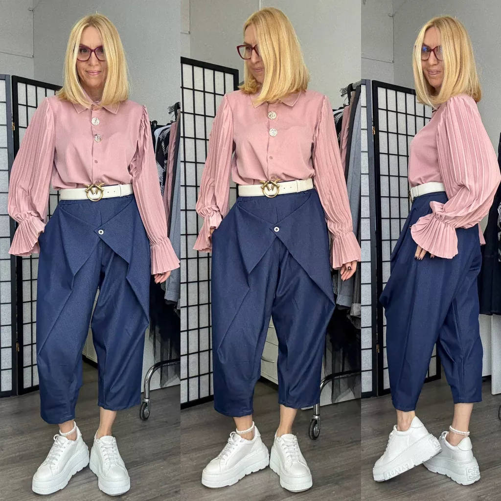 Gumis derekú, elől átlapot nadrág. Zsebes, tartozik hozzá öv is.