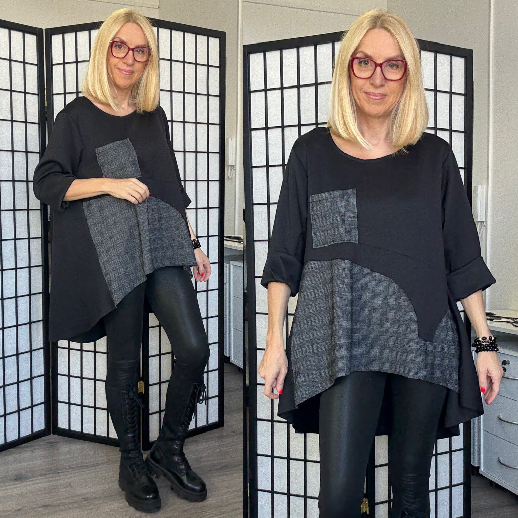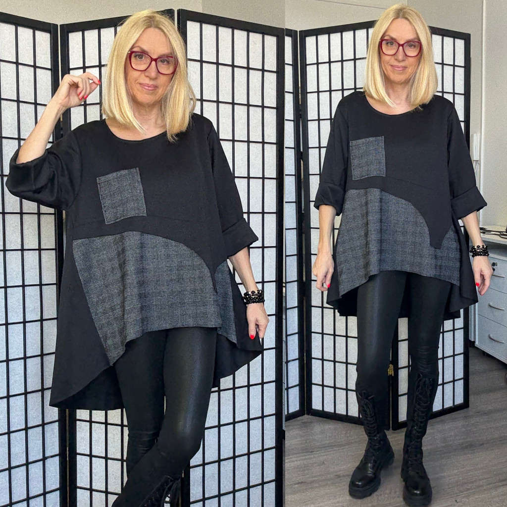 A-vonalú, asszimetrikus lefelé bővülő tunika.