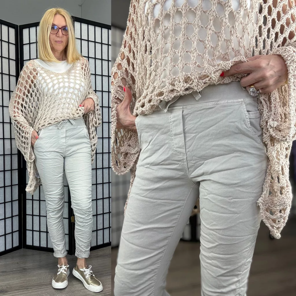 Elasztikus farmer, gumis megkötős derékkal.