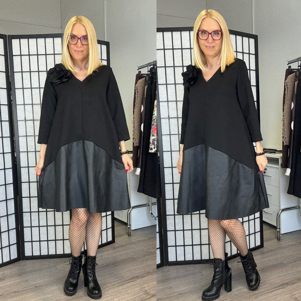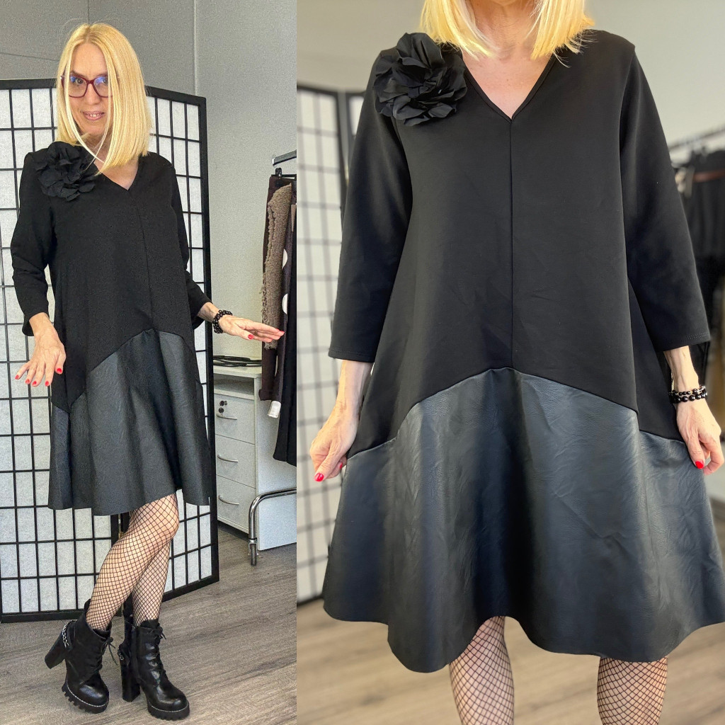 Mitica rózsás 3/4-es ujjú bőrbetétes ruha 8883 - fekete