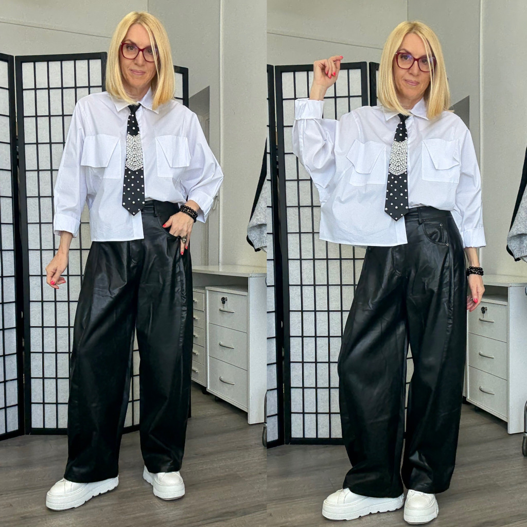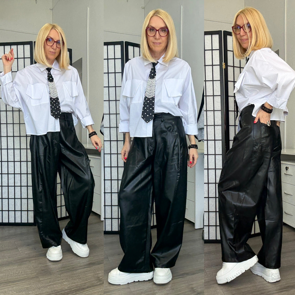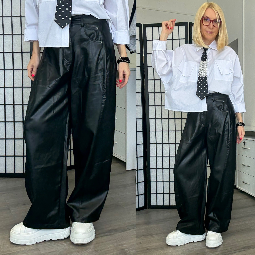 Magasderekú, bőratású nadrág. Csípőben bővebb, de lent kicsit összetarató.