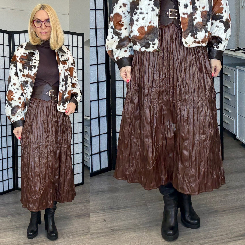 Gumis derekú, gyűrt hatású vegánbőr szoknya, alsószoknyával.