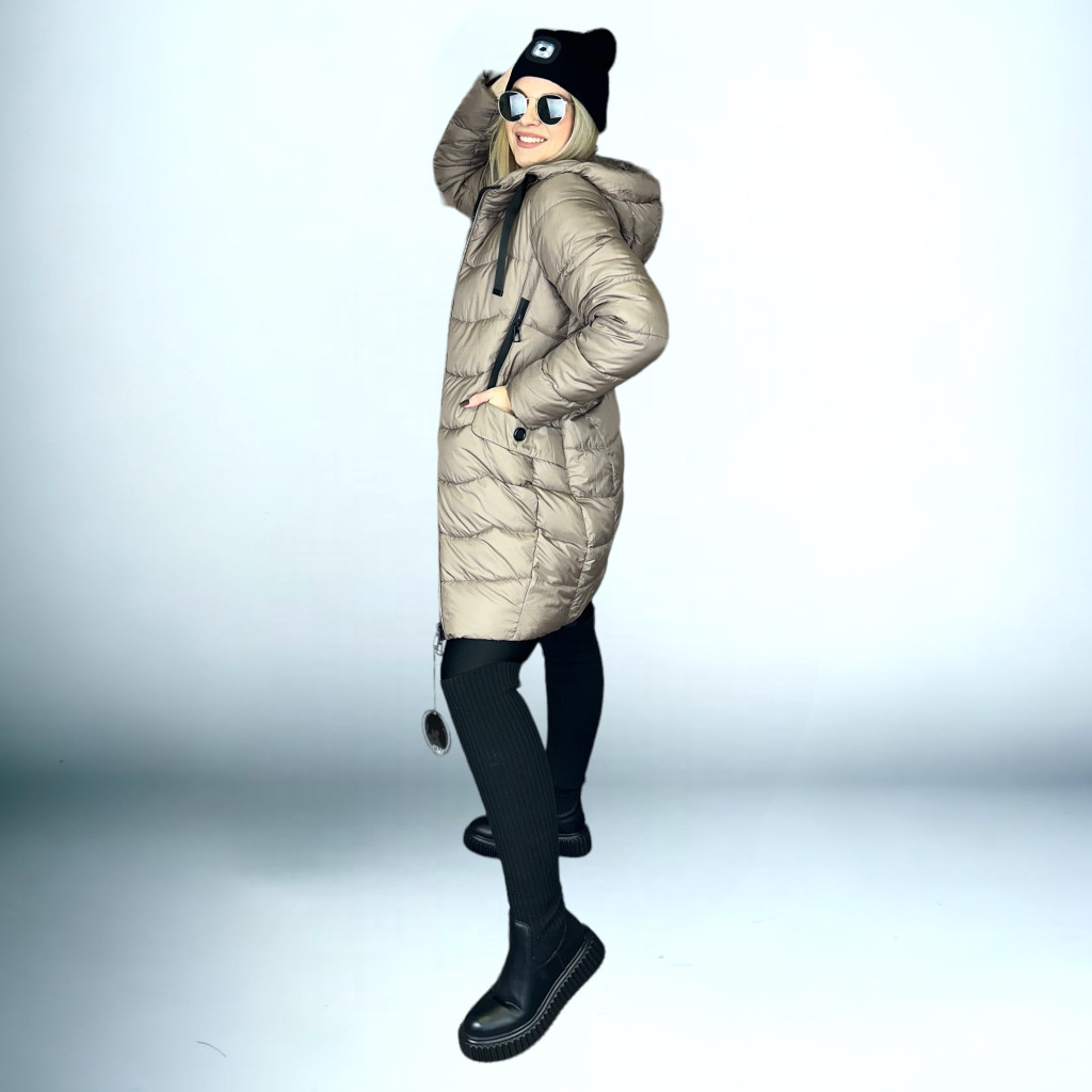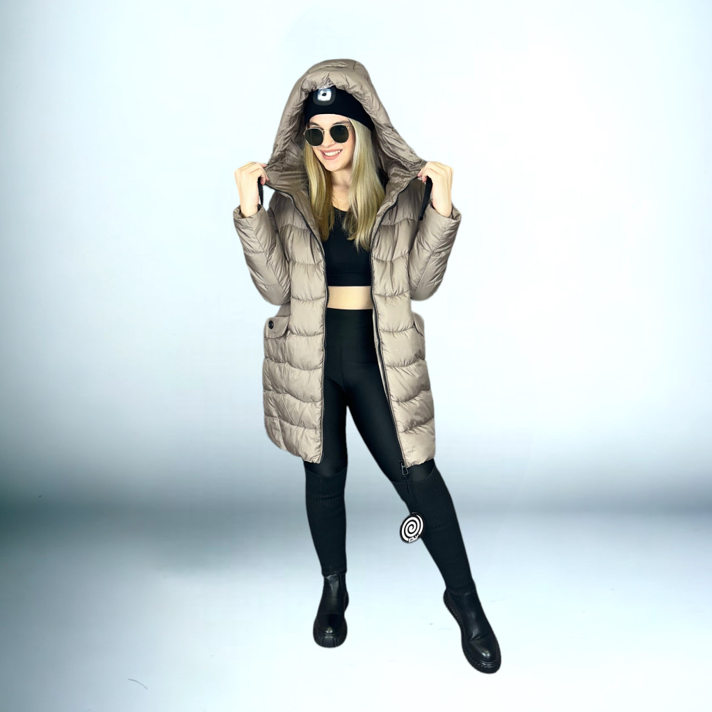 Ez a kapucnis steppelt téli kabát egy praktikus és stílusos választás a hideg időjáráshoz. A kabát sima zsebbel rendelkezik, melynek zsebének díszítése gombos kivitelű. A kabát cipzárral záródik, ami biztosítja a könnyű és megbízható záródást. A belseje vatta töltetű, így melegen tart a hideg időben, és mosógépben is mosható, ami könnyű tisztántartást tesz lehetővé. A mellrészen található cipzár csak díszítőelemként funkcionál, így tovább növeli a kabát megjelenését. Ez a téli kabát kombinálja a funkcionalitást és a stílust, ideális választás lehet a mindennapi viseletre a hideg hónapokban.