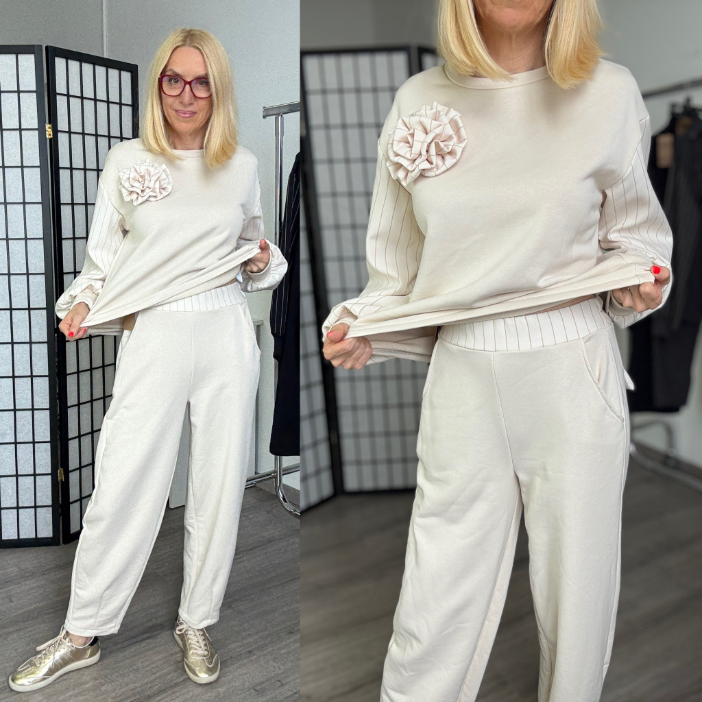Buggyos ujjú felső, rávarrott rózsa díszítéssel. Gumis derekú, megkötős bőszárú nadrággal. S-L méretig ajánljuk.
