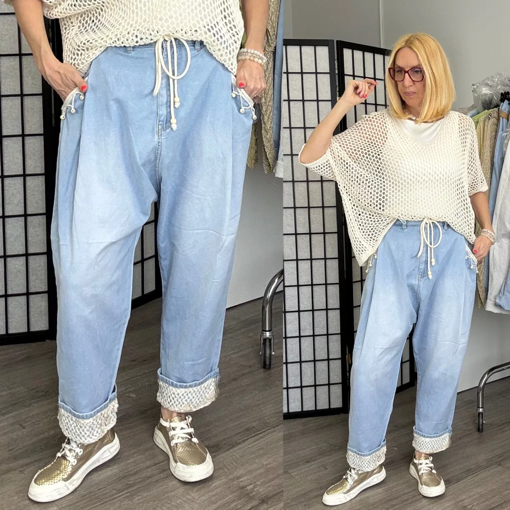 Gumis derekú ülepes farmer, horgolt dísszel.