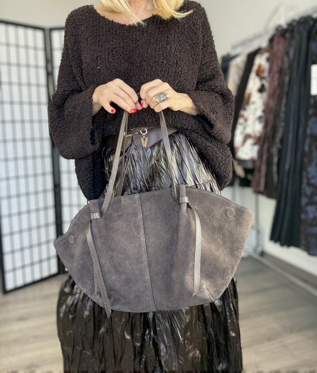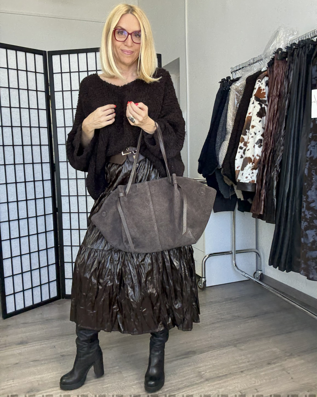 A valódi hasított bőr shopper táska tágas belsővel rendelkezik, így a mindennapi holmik kényelmesen elférnek benne. Belül egy bőr neszeszer is helyet kapott, amely cipzárral záródik – tökéletes a kisebb értéktárgyak biztonságos elhelyezésére. A shopper főrekesze szintén cipzárral záródik, így a tartalma mindig biztonságban van.