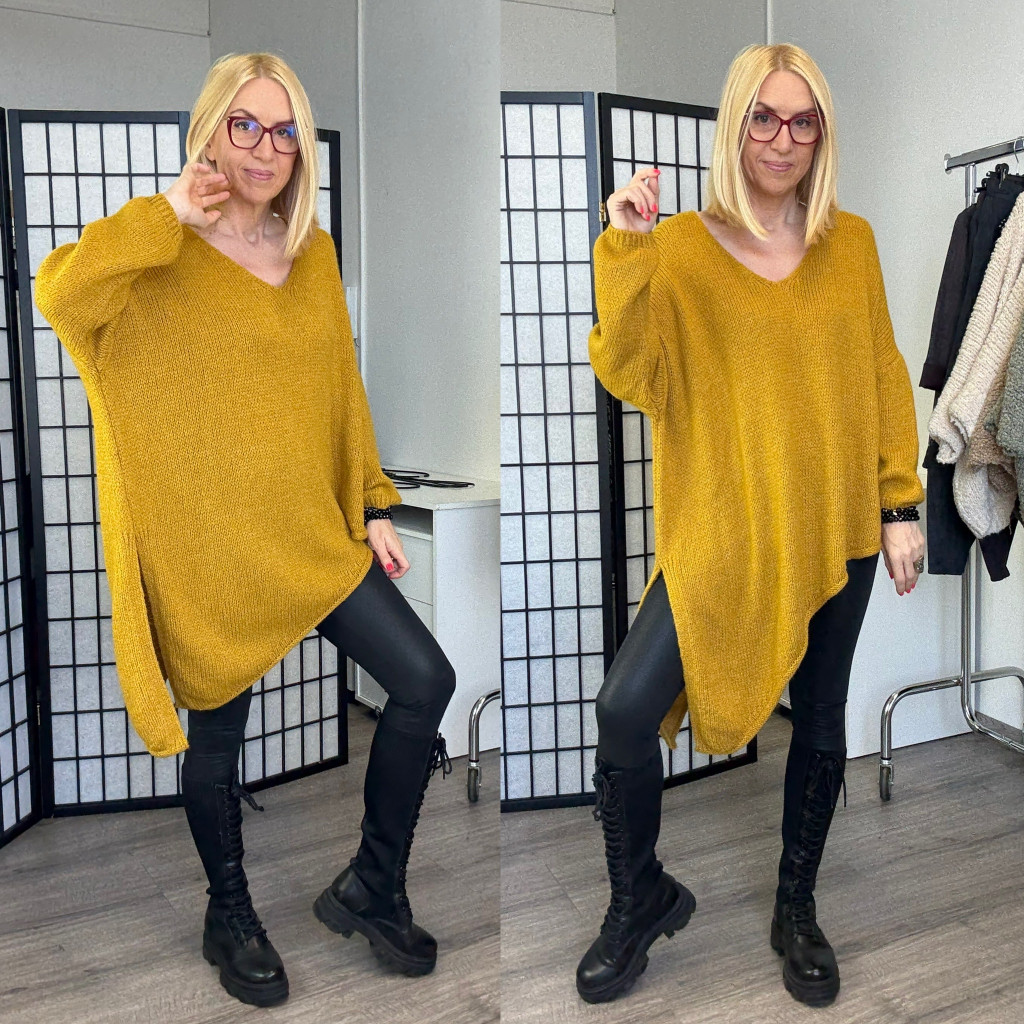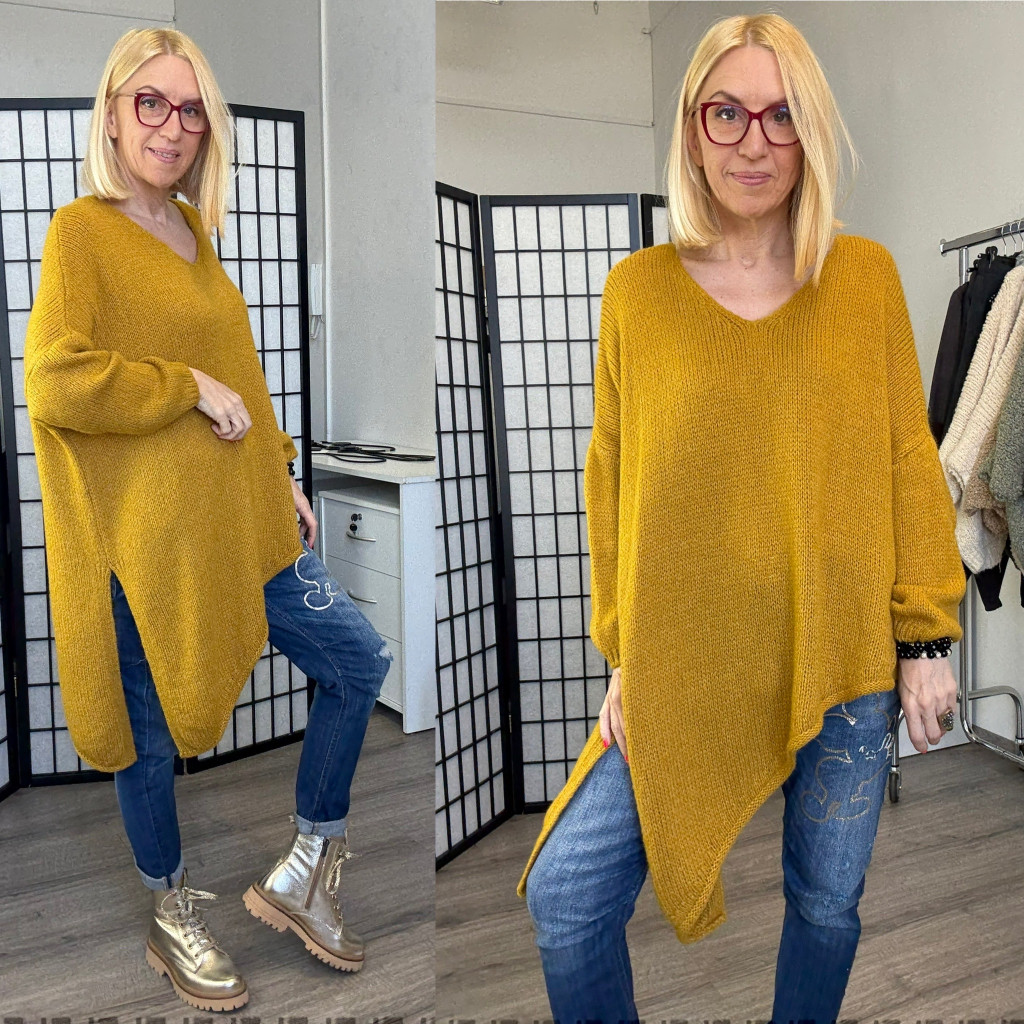 V kivágású aszimmetrikus kötött pulóver. Hosszabb oldalán sliccelt.