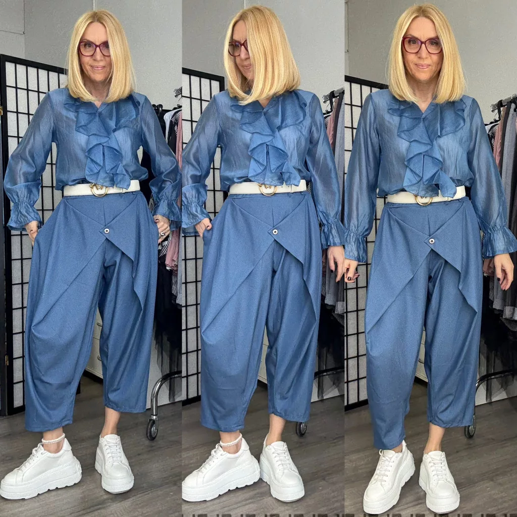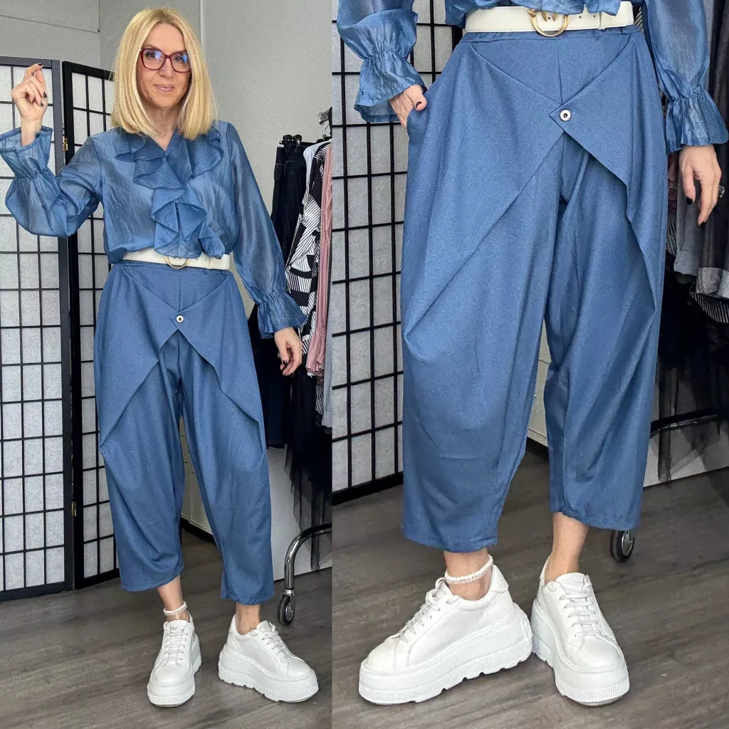 Lux Luna elől átlapolt gombos farmerhatású nadrág övvel 5181-középkék
