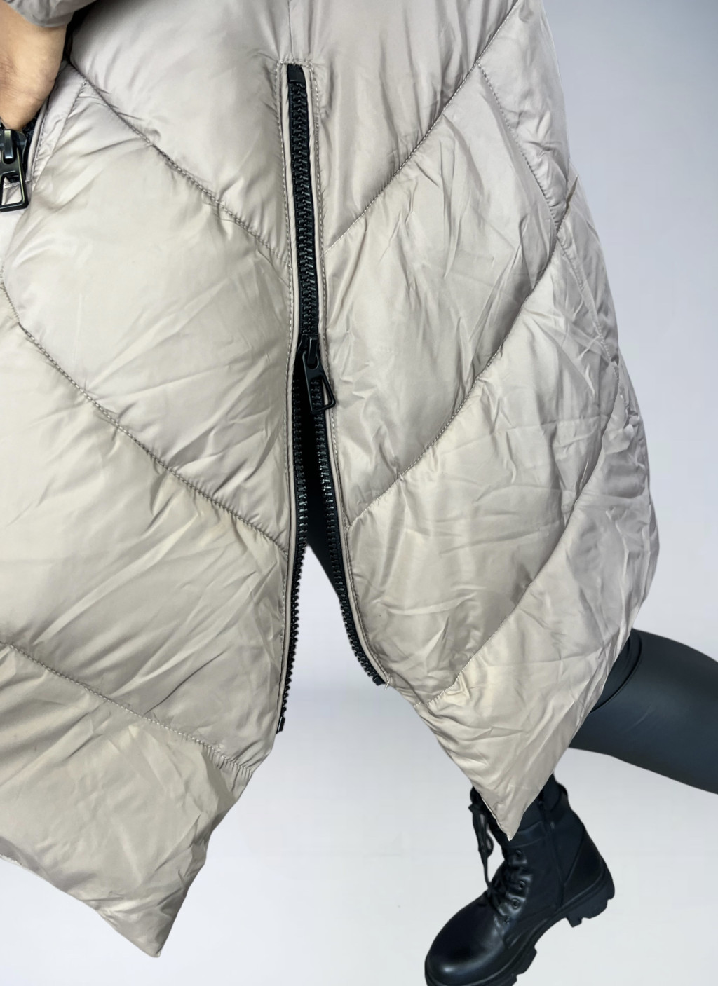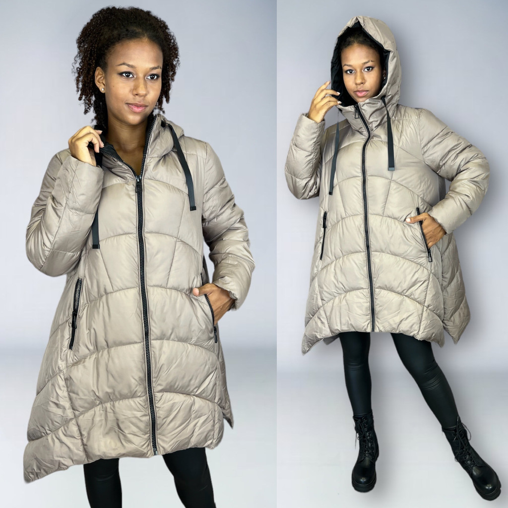 Ez a rövid, oldalán hosszított kabát modern és praktikus választásnak tűnik. A cipzárral záródó kabát és zsebek könnyű használattá teszik, míg a vatta töltetű belseje melegen tart a hideg időben. A kabát mindkét oldalán felcipzározható kialakítása stílusos és rugalmas megjelenést biztosít. Összességében egy kényelmes és divatos opció a mindennapi viseletre.