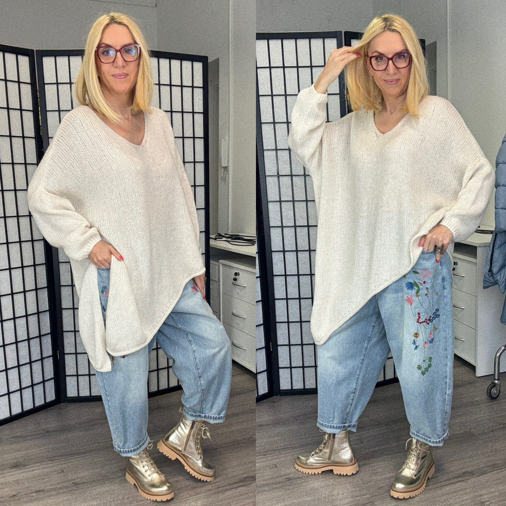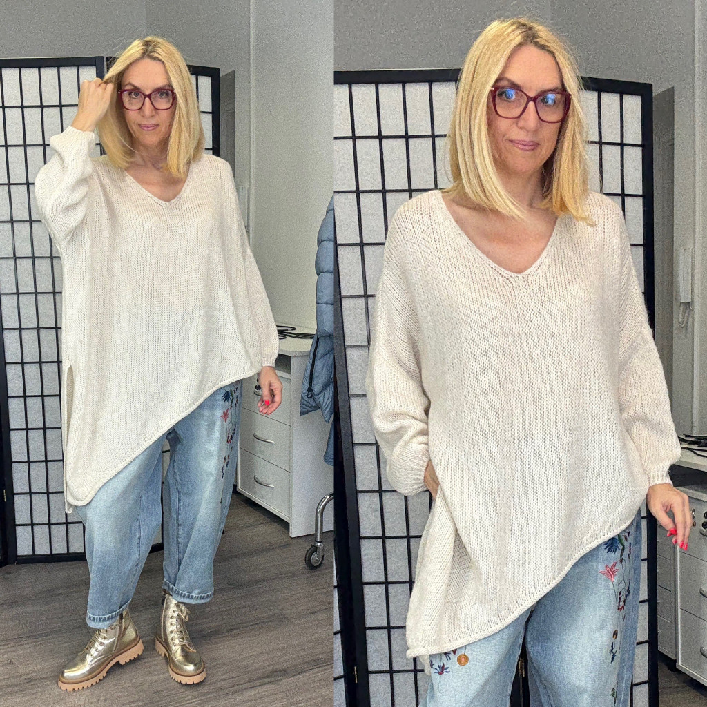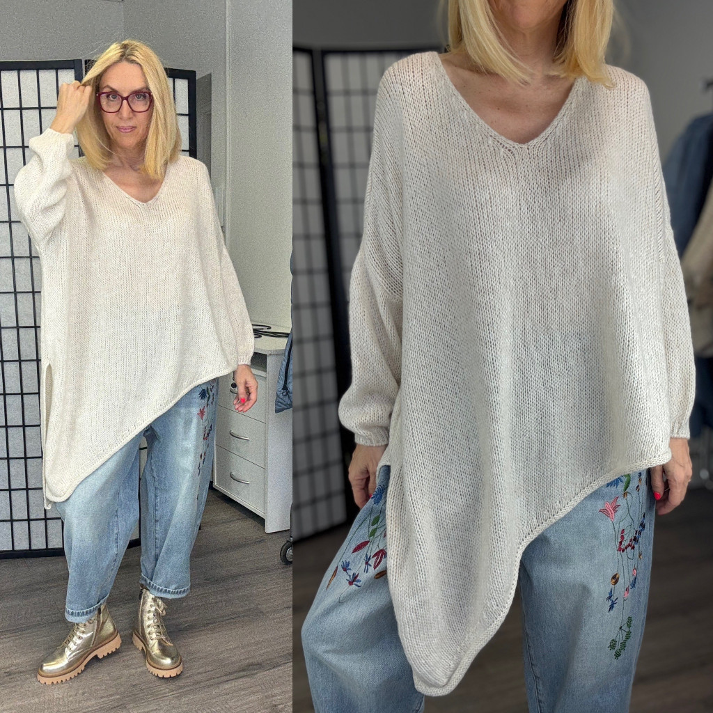 V kivágású aszimmetrikus kötött pulóver. Hosszabb oldalán sliccelt.